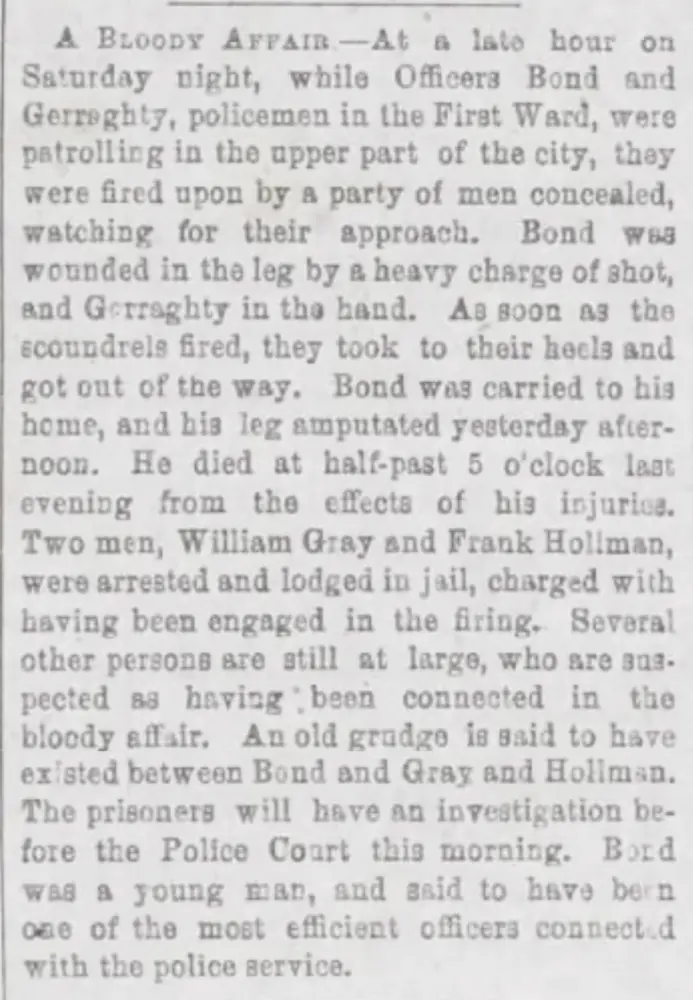 Patrolman Bond was shot and killed in the line of duty. No other details of the incident are known.