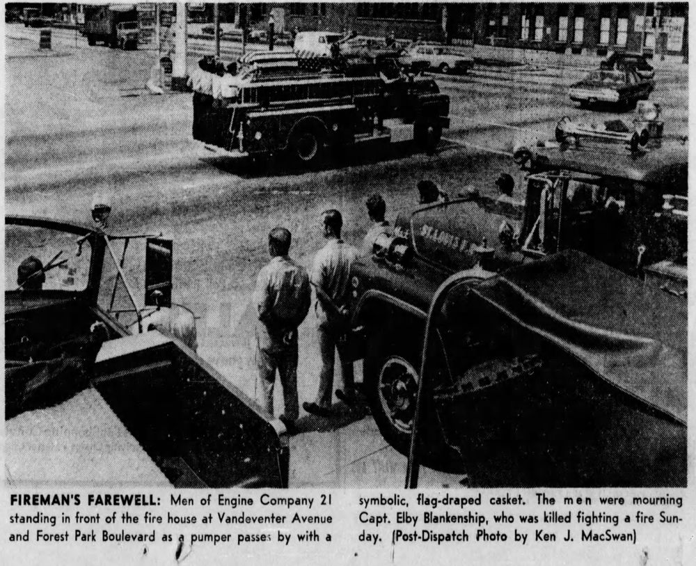 Captain Blankenship was standing outside of the fire building directing firefighters when a wall gave way. He was pinned by falling bricks and concrete blocks succumbing to his injuries later at the hospital.