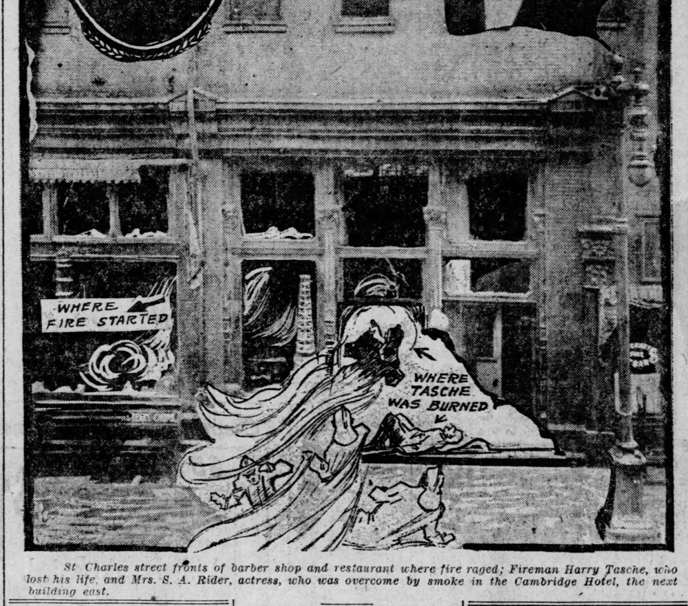 While attempting to fight a fire in a barber shop at 519 Saint Charles Street, Firefighter Tasche was severely burned as he attempted to attack the fire with a chemical extinguisher through the front door. Reports stated that a window in the rear of the building blew out just as they were entering from the front. A large wall of fire then engulfed Firefighter Tasche who was leading the line of firefighters through the door. Frozen hydrants resulted in severe water supply delays.