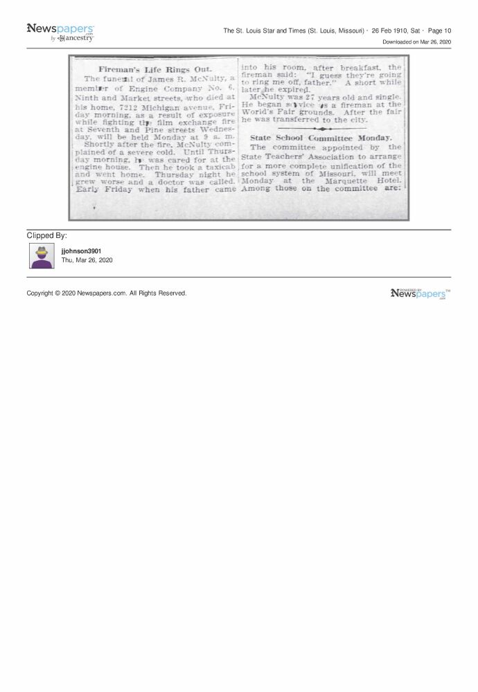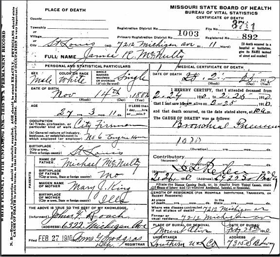 On Wednesday February 23, members of the St. Louis Fire Department fought a fire in the film exchange at 7th and Pine Streets. Shortly after the fire, Firefighter McNulty complained of a severe cold. He was cared for at Engine House #6, which he was assigned, and went home on Thursday. On Thursday night, his symptoms became worse and a doctor was called for. Firefighter McNulty died from pneumonia the following day.
