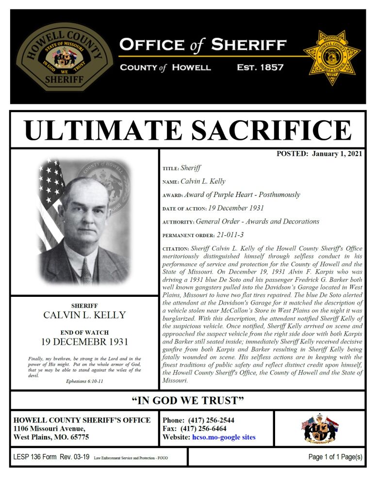 Sheriff Kelly was shot and killed by two members of the Barker Gang while investigating a report of a suspicious car. One of the suspects was responsible for the murder of Chief Manley Jackson, of the Pocahontas Police Department, Arkansas.